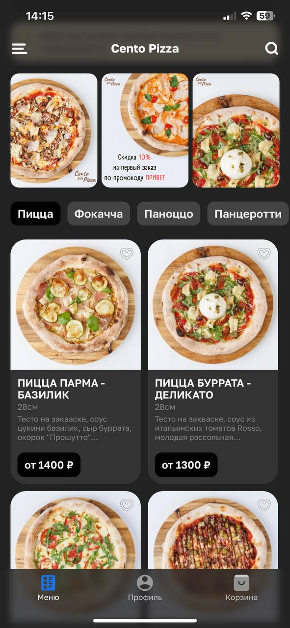 Тесто на закваске, томатный соус, сыр моцарелла, ветчинный окорок, шампиньоны, итальянские белые грибы в масле, базилик и ароматное масло розмарин-чеснок