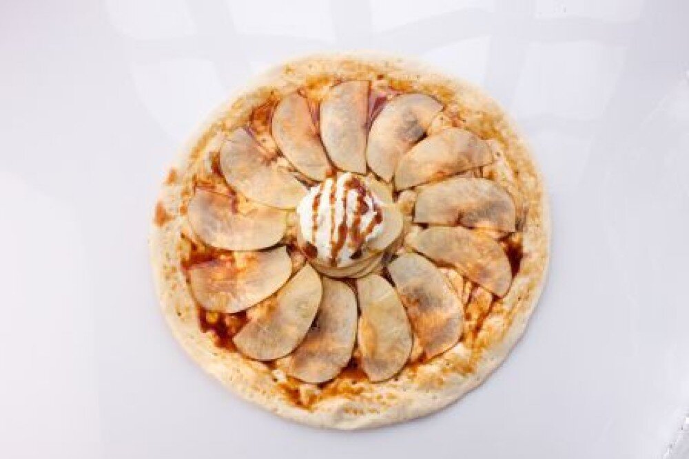 Сладкая пицца с яблоками и крамельным топпингом, украшенная шариком мороженого пломбир - вкус на выбор