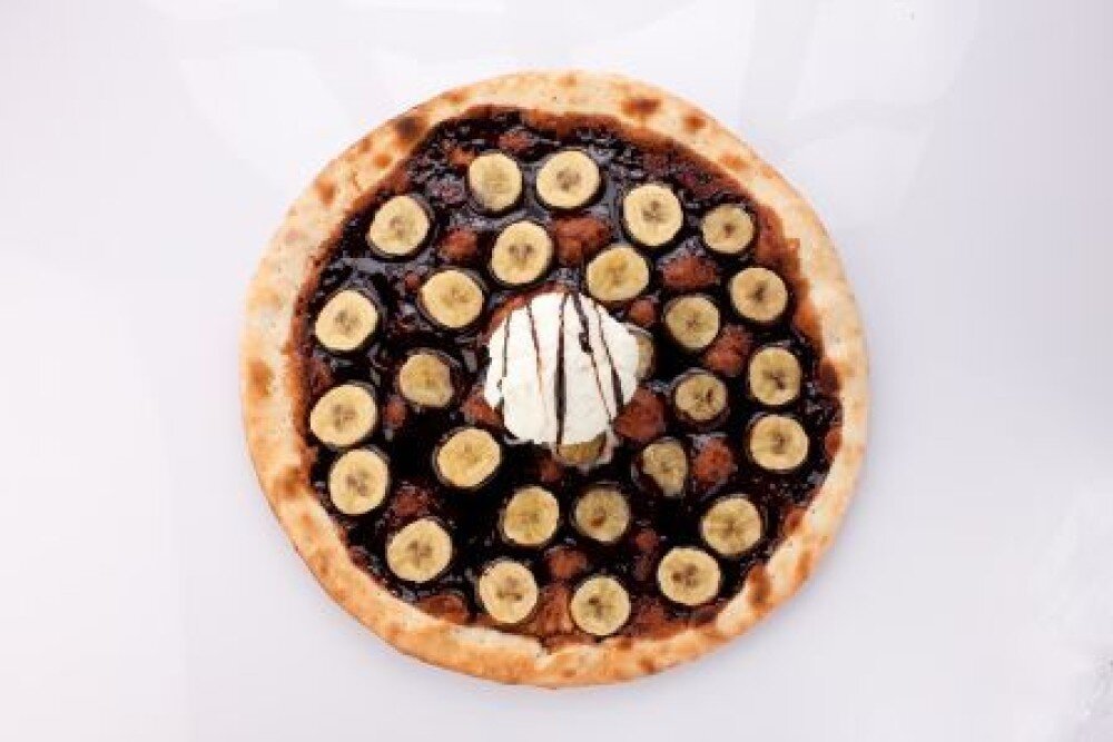 Сладкая пицца с бананами и шоколадным топпингом, украшенная шариком мороженого пломбир - вкус на выбор