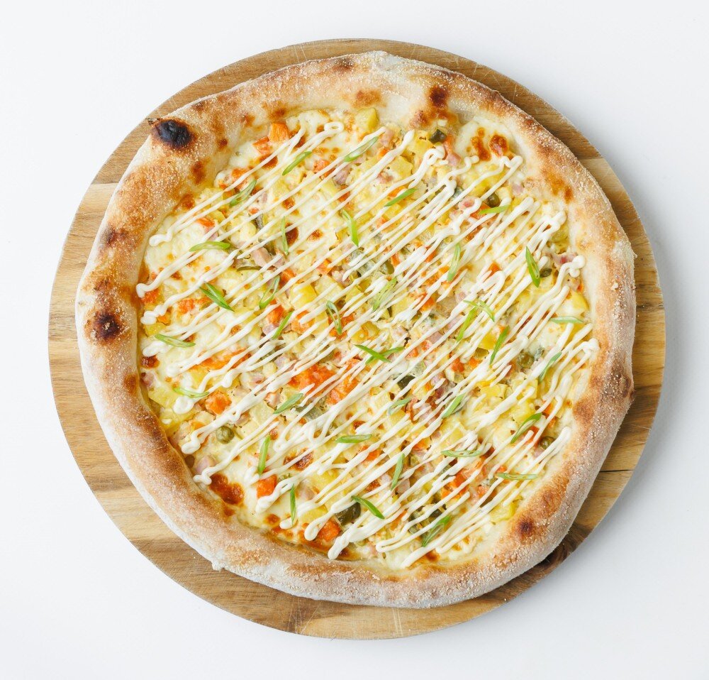 Новогоднее меню Майонез с чесноком, сыр моцарелла, классический салат "Оливье". По желанию можно добавить яблоко и зелёный лук